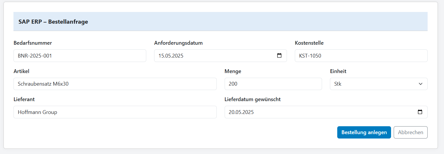 Die Oberfläche basiert auf typischen Abläufen, wie ich sie in meiner Arbeit mit SAP kennengelernt habe – sei es zur Materialanforderung, Lieferantenpflege oder internen Bestellung.