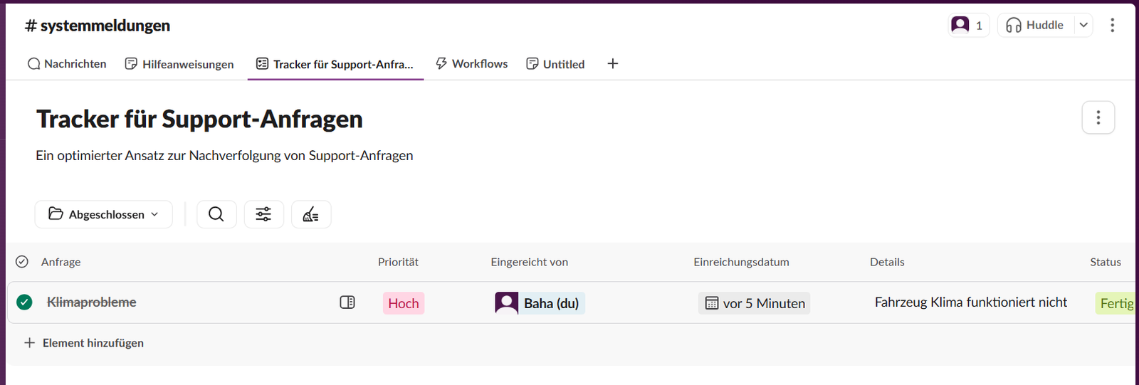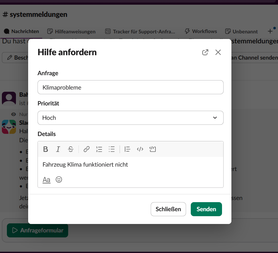 Auch hier handelt es sich um simulierte Screenshots mit Dummy-Inhalten. Ziel war es zu zeigen, dass ich moderne Kommunikationstools wie Slack kenne und praktisch im Supportumfeld genutzt habe – etwa zur Abstimmung bei laufenden Anfragen oder in Projekten mit mehreren Beteiligten.